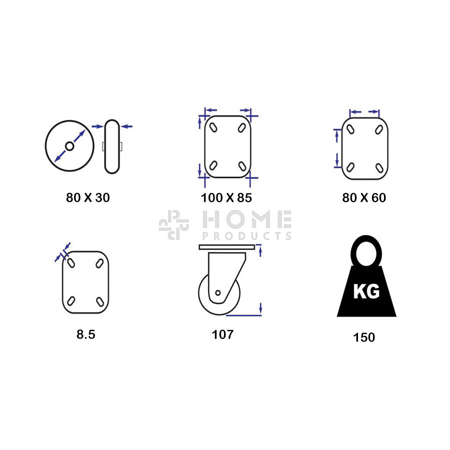 Swivel castor, diameter 80 mm, polyamide wheel, load capacity up to 150 kg, polyamide core